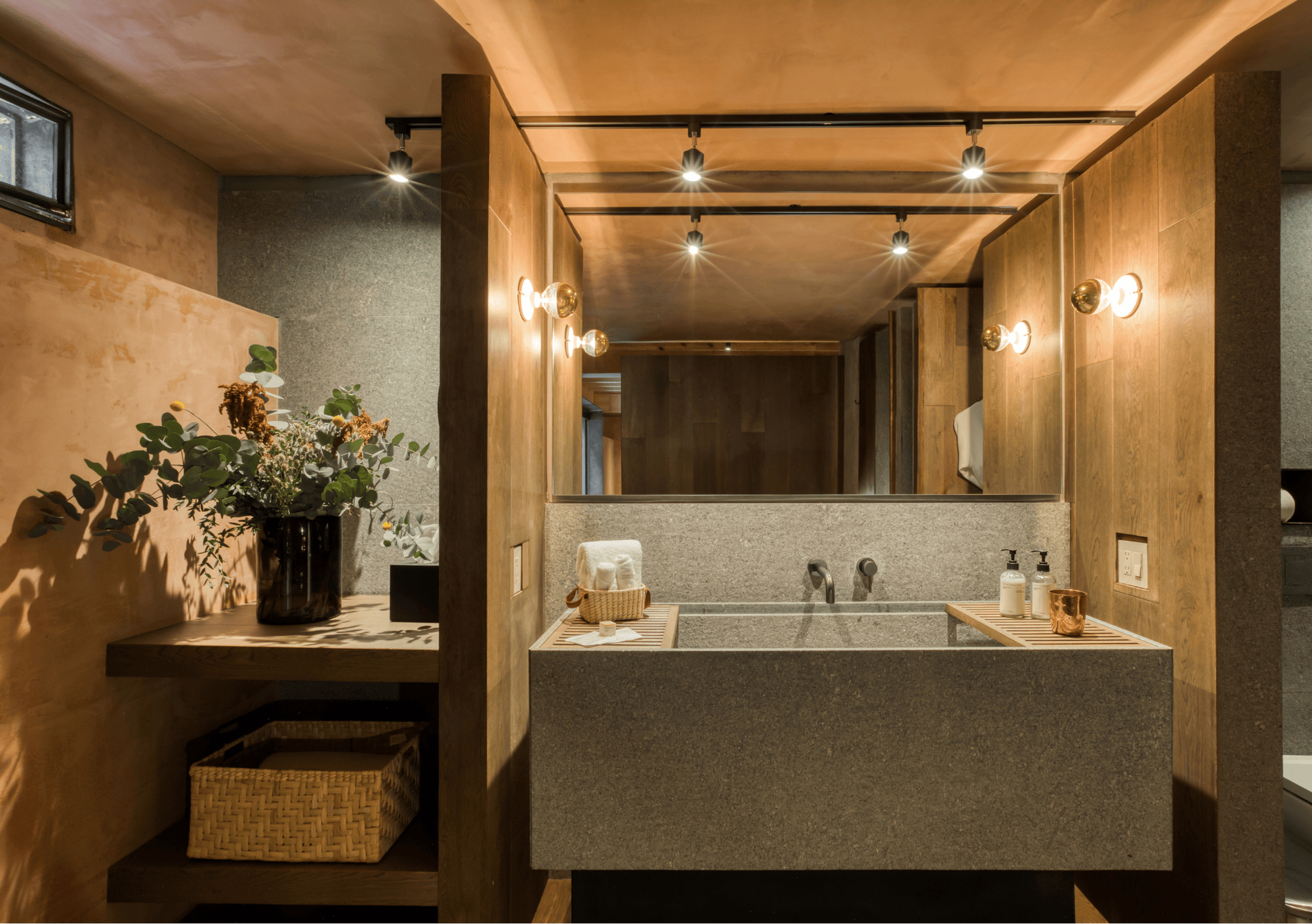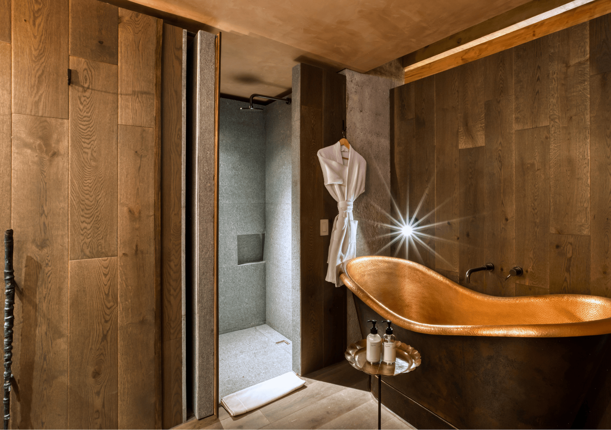 Serene and intimate, this guest room is a haven of quiet luxury. Its warm, earthy tones and natural textures create a grounding atmosphere, while a private terrace offers a secluded outdoor space. A handcrafted copper bathtub invites deep relaxation, and curated design elements—conceived by VERTEBRAL and H116—enhance the room’s timeless elegance. Nestled on the ground floor, this space embraces a cozy ambiance.