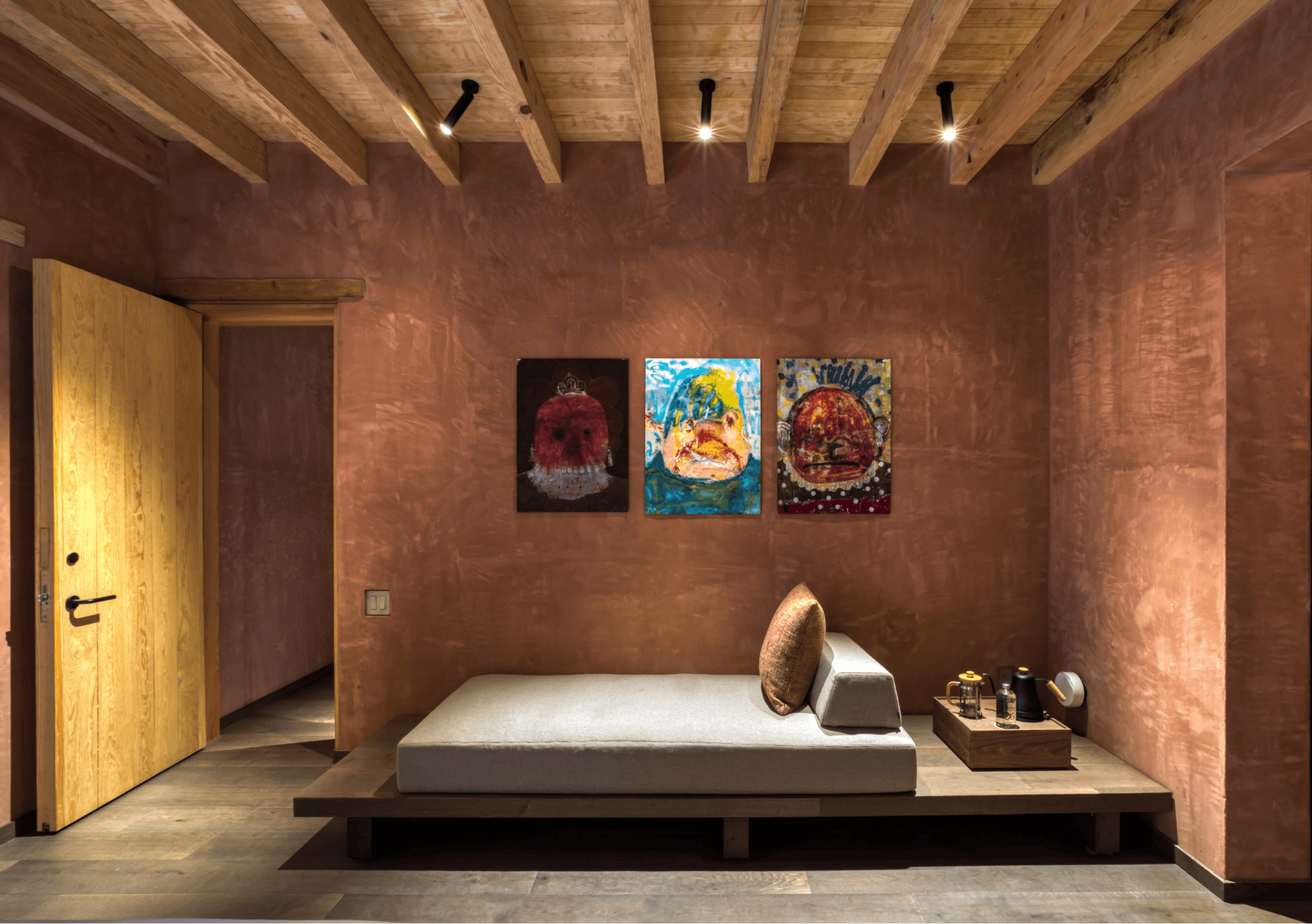 Warm and refined, this thoughtfully designed guest room offers a tranquil retreat with understated elegance. The view to the central patio makes this space float amongst vegetation. Our only room that can be reconfigured from a King bed into a two-twin bedroom. Surrounded by earthy tones, handcrafted details, and natural textures create an inviting ambiance, within a ensures comfort and functionality. With generous closet space, this room is perfect for longer stays, offering both practicality and style. A built-in window seat provides a cozy nook for reading or quiet reflection, framed by soft natural light. The en-suite bathroom, with its stone finishes and artisanal accents, adds to the sense of timeless sophistication.